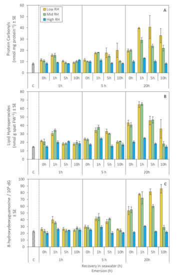 Oxidative damage biomarkers in juvenile Perna canaliculus exposed to different relative humidity (RH; low, mid, high) and emersion (1, 5, 20 h) treatments, followed by recovery in seawater (0, 1, 5, 10 h). Control bar (c) shows biomarker concentration in mussels that were continuously immersed in flowing seawater (excluded from statistical analysis). (A): Protein carbonyls (PCs); (B): Lipid hydroperoxides (LPs); (C): 8-hydroxydeoxyguanosine (8-OHdG). Data are mean concentration ± standard error (SE, n = 3).