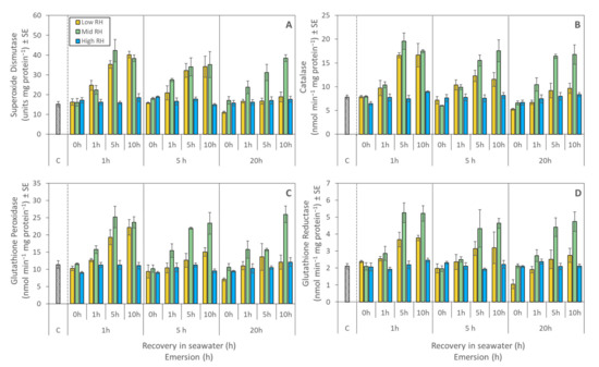 Antioxidant biomarker activity in juvenile Perna canaliculus exposed to different relative humidity (RH; low, mid, high) and emersion (1, 5, 20 h) treatments, followed by recovery in seawater (0, 1, 5, 10 h). Control bar (c) shows biomarker activity in mussels that were continuously immersed in flowing seawater (excluded from statistical analysis). (A): Superoxide Dismutase (SOD); (B): Catalase (CAT); (C): Glutathione Peroxidase (GPx); (D): Glutathione Reductase (GR). Data are mean concentrations ± standard error (SE, n = 3).