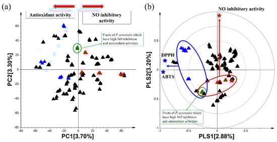 (a) PCA score plot; (b) PLS biplot derived from the UHPLC-LTQ-Orbitrap-MS dataset for Table 1. indigenous plants. PLS biplot shows the correlation between the metabolite variations and the selected test bioactivities in the extracts of the 50 indigenous plants. The samples were analyzed using three analytical replicates for each sample. ▲: Plant species which have high antioxidant activities; ▲: Plant species which have high NO inhibition activity; ▲: Plant species which include in 50 indigenous plants.