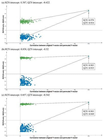 Permutation plots of the PLS model describing the R2 and Q2 Y-intercepts for NO inhibitory (a), ABTS (b), and DPPH (c) activities of 50 indigenous plant extracts. The PLS model was validated using 200 permutation tests to evaluate its goodness of fit and predictive power.