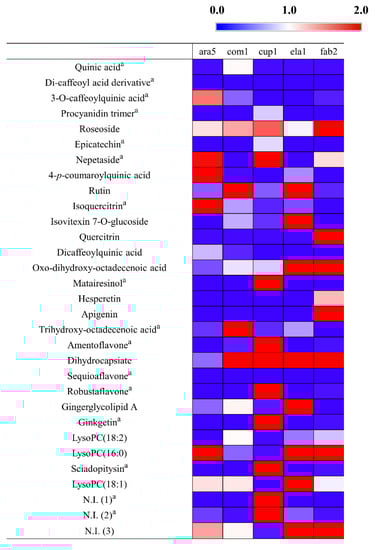 Heatmap analysis in plant species which have high antioxidant activities derived from UHPLC-LTQ-Orbitrap-MS/MS data. The heatmap indicates the relative contents in the secondary metabolites among the different fractions. a Metabolites that have high contribution to the bioactivities were determined by PLS-biplot (VIP > 1.0, p < 0.05). N.I.: Non-identified metabolite.