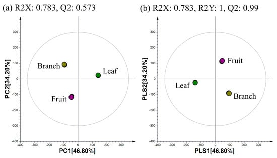 (a) PCA and (b) PLS-DA score plots of the results obtained for the different parts from P. orientalis analyzed by UHPLC-LTQ-Orbitrap-MS/MS. The samples were analyzed using three analytical replicates for each sample. ●: Fruits of P. orientalis, ●: Leaves of P. orientalis, ●: Branches of P. orientalis.