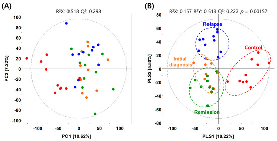 Metabolic differences between patients with acute myeloid leukemia (AML) and healthy individuals. (A) Principal component analysis (PCA) and (B) partial least squares–discriminant analysis (PLS-DA) score plots obtained using the dataset from gas chromatography–time of flight–mass spectrometry analysis of serum samples from healthy individuals (control) and patients with AML. Red dots, control group; orange dots, initial diagnosis group; green dots, remission group; blue dots, relapse group.