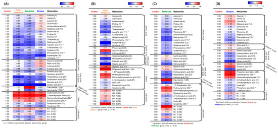 Representative heatmaps for the relative contents of significantly different metabolites between the healthy individuals and patients with acute myeloid leukemia (AML). (A) Differences between the control group and the initial diagnosis, remission, and relapse patient groups. (B) Differences between the control and initial diagnosis groups. (C) Differences between the control and remission groups. (D) Differences between the control and relapse groups. The colored squares (blue-to-red) represent fold changes normalized by the average content of each metabolite in the control group. The color scheme is as follows: lower limit value, blue; middle value (1.0), white; and upper limit value, red. * means that metabolites significantly differed between the control and patient group.