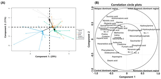 Non-paired analysis might lead to the loss of clinically relevant information originating from individual diversity. Therefore, we performed a paired-sample analysis, wherein each patient sample from the initial diagnosis, remission, and relapse groups in the study had serial paired samples for age/sex-matched healthy individuals. After performing PLS–DA on patients with AML, we additionally conducted spared PLS–DA (sPLS–DA) to determine if the metabolite profiles in patients significantly changed depending on their pathologic status. sPLS–DA enables the selection of the most predictive or discriminative features in the data to help classify the samples [18]. The analytical method helps predict a patient’s disease state using a selected variable. In addition, the calculation efficiency of sPLS–DA combined with graphic display confers stronger advantages in the multiclass case than the variable selection approach. Therefore, we applied sPLS–DA to determine whether the differential metabolites found in PLS–DA would be involved in changing the patients’ pathologic state. Samples from healthy individuals were distinguished from those of patients in the initial diagnosis, relapse, and remission groups by differential expression of 29% of the total metabolites (Component 1). Furthermore, patients in the initial diagnosis, relapse, and remission groups were predicted by differential expression of 11% of the total metabolites (Component 2) (Figure 3A). In the case of Component 1, the metabolite profile of the serum of patients in the remission group differed from that of individuals in the control group. In the case of Component 2, 11% of the total metabolites showed upregulated expression in the serum of patients in the initial diagnosis and relapse groups, whereas the remission and control groups showed similar characteristics. Therefore, it was found that the metabolites expressed after the initial diagnosis phase (component 2) were related to AML progression. Additionally, the metabolites contributing to each pathological state were identified after categorizing them into four quarters based on the zone representing each pathological state. The metabolites divided into four regions separated by the zero intersection point of each axis indicated a strong correlation between disease progression and metabolite levels (Figure 3A).
