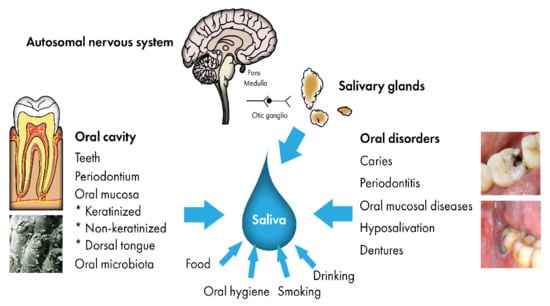 - Pedersen, A.M.L.; Sørensen, C.E.; Proctor, G.B.; Carpenter, G.H.; Ekström, J. Salivary secretion in health and disease. J. Oral Rehabil. 2018, 45, 730–746. [Google Scholar] [CrossRef]