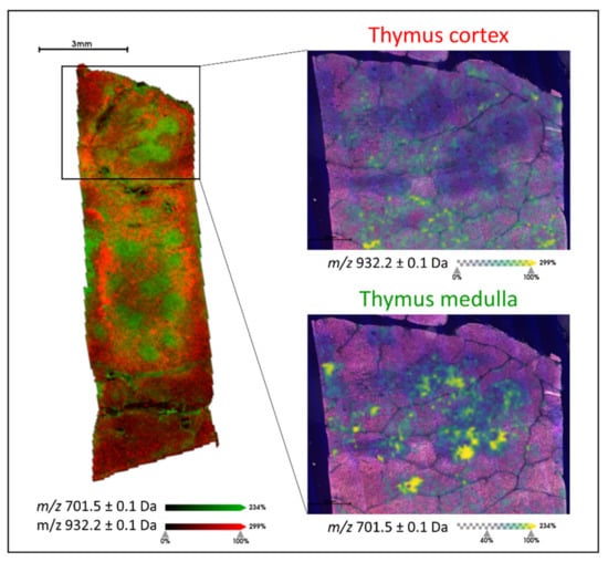 Initially, the human thymus tissue was analysed by MALDI-MSI in order to generate a lipid signature (of m/z values) that was indicative of an environment rich in T lymphocytes. To achieve this, the medulla region of the thymus was considered given that it contains single positive T lymphocytes (CD4+ or CD8+, SP), in the later stages of maturation and differentiation, which may then be found in the colorectal cancer tissue. From those m/z signals that followed the morphology of the medulla region of the thymus and were detected as m/z features during the feature detection pipeline, a total of 18 could be annotated using liquid chromatography coupled with mass spectrometry (LC-MS)-based lipidomic approach and these are summarised in Supplementary Materials S1. The mass list obtained from this pool of single positive T lymphocytes was then employed to determine whether it could be used to differentiate them from those double-positive (DP) T lymphocytes in the earlier stages of maturation and differentiation. When comparing the lipid profiles of SP and DP T lymphocytes in thymus tissue, differences in their profiles were observed within the m/z 700 to 950 range (Supplementary Figure S1). In fact, of the 18 m/z features, four of them m/z 701.5 [PA(18:0/18:1)], 702.6 [PE(40:2)], 723.4 [PA(20:4/18:0)], and 725.4 [PA(18:0/18:3)] could discriminate SP from DP T lymphocytes. This is illustrated in Figure 1, where m/z 701.5 is overlaid with m/z 932.2, a lipid signal whose tissue distribution was localised to the cortex region of the thymus (DP T cells). The latter signal, m/z 932.2, was not detected as an m/z feature in the medulla due to its insufficient intensity and for this reason, it is not present in the curated peak list.