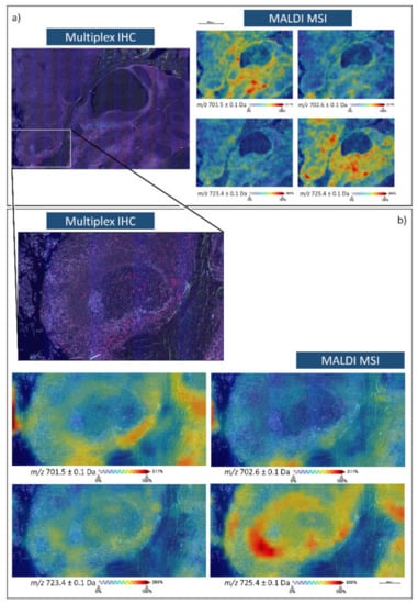 Multiplex immunohistochemistry (Blue, CD3; Green CD4; Red, CD8, Grey, 4′,6-diamidino-2-phenylindole (DAPI)) and MALDI-MS images of m/z 701. 5 [PA(18:0/18:1)], 702.6 [PE(40:2)], 723.4 [PA(20:4/18:0)], and 725.4 [PA(18:0/18:3)] in human tonsil tissue. (a) is representative of a larger area of the tonsil which encompasses both lymphocytes and epithelial cells whilst (b) provides an inset from a follicle that is surrounded by a denser distribution of T lymphocytes.