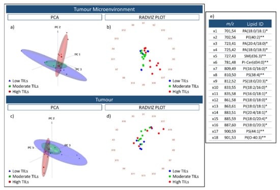 Three-dimensional PCA score charts of the Low TIL (blue), Moderate TIL (Green), and High TIL (red) groups using spectra obtained from the tumour microenvironment (a) and tumour (c) regions. The first three components explained 93.2% (PC1 74.3%; PC2 11.8%; PC3 6.2%) of the variability within the data. Radviz plots generated using the same spectra from the tumour microenvironment and tumour are presented in (b,d). The 18 m/z features that were used for the PCA analysis and Radviz plots are reported in (e) and are linked with the identifiers (ie. X1) that are placed around the circumference of the Radviz plot. The putative lipid ID assigned to these m/z features is also provided; * indicates those lipids annotated based on accurate mass, isotopic distribution and MS/MS whilst ** indicates those lipids annotated based on accurate mass and isotopic distribution.