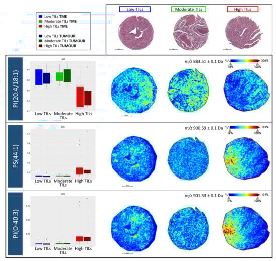 (Left) Intensity box plots for m/z 883.1 [PI(20:4/18:1)], m/z 900.6 [PS(44:1)], and m/z 901.5 [PI(O-40:3)] among the Low tumour infiltrating lymphocyte (TIL) (blue), Moderate TIL (green), and high TIL (red) groups in both the tumour microenvironment (TME) and tumour regions. (Right) Example MALDI-MS images illustrating the distribution of these three lipid features in colorectal cancer tissue cores. Intensity and scale bars are provided whilst the H&E stained images of the same cores, obtained after MALDI-MSI and liquid chromatography coupled with tandem mass spectrometry (LC-MS/MS) analysis, are provided above for reference.