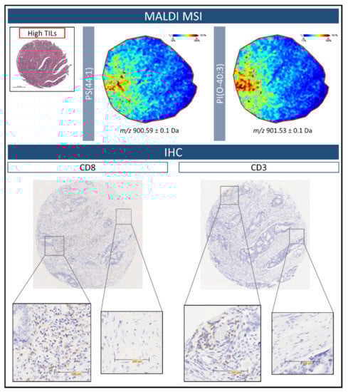 In particular, three m/z features, m/z 883.1 [PI(20:4/18:1)], m/z 900.6 [PS(44:1)], and m/z 901.5 [PI(O-40:3)] were shown to have the greatest impact when separating the High TIL cases from the Low and Moderate TIL cases, with a decreased and increased intensity, respectively, with this trend being particularly evident within the tumour microenvironment. In particular, phosphatidylinositol species play an essential role in a wide range of cellular functions such as ligand-receptor signal transduction and membrane trafficking. Alterations in the phospholipid composition of the plasma membrane have an impact on T lymphocytes functions and contribute to inflammatory responses or immune suppression []. Given that MALDI-MSI in negative ion mode is particularly adept at detecting this class of lipids, it may suggest why those cases with differing TIL content may be distinguished using this approach, especially considering that high TIL content is associated with an inflamed immune environment that also contains a greater breadth of T lymphocytes []. It is also interesting to note that in the cores with a high TIL content, PI(20:4/18:1), PS(44:1), and PI(O-40:3) were localised to different regions of histologically similar tissue. When performing preliminary correlations of the MALD-MSI data with IHC, the highest signal intensity for m/z 900.6 [PS(44:1)] and m/z 901.5 [PI(O-40:3] were found in regions of CRC tissue with a high number of CD3 and, in particular CD8, T lymphocytes (Figure 5), with a negligible intensity being observed in those regions with scarce TIL content. This may be suggestive of the different T lymphocytes and immune environments present in these cores, however, this should be confirmed in future studies using a greater number of T lymphocyte markers that also provide a more comprehensive indication of the tumour immune environment []. Moreover, this proof of principle study was performed on a relatively limited number of CRC cases, and a more in-depth study that considers a larger cohort and also incorporates the clinical outcome of these patients is required to confirm these preliminary findings and evaluate how spatial lipidomics could provide a complementary adjunct in this field.
