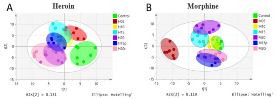 PLS-DA model of metabolic patterns for mouse serum. (A) Serum data from heroin-treated mice. Heroin was administered for 5 days (H05, red dots), 10 days (H10, yellow dots), 15 days (H15, light-blue dots), and 20 days (H20, purple dots). Mice were subjected to withdrawal (H15p, blue dots, withdrawal for 5 days after 10 days of heroin administration) and re-administration (H20r, pink dots); the control group is shown as green dots. (B) Serum data from morphine-treated mice. Morphine groups are labeled in the same way as heroin groups.
