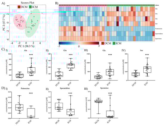 Comparison of significant metabolic parameters of DCM and ICM pre-LVAD. (A) PCA of pre-LVAD DCM vs. pre-LVAD ICM significantly different metabolites. (B) Heatmap visualization of the seven metabolites significantly different between DCM and ICM pre-LVAD. (C) I–IV Amino acid levels of pre-LVAD DCM vs. pre-LVAD ICM. Depicted are min, max, median, and single values. Significance was calculated with a t-test) or the Mann–Whitney U test). * indicates significant to DCM (*** = p < 0.001) (D) I–III Biogenic amine levels of pre-LVAD DCM vs. pre-LVAD ICM. Depicted are min, max, median, and single values. Significance was calculated with a t-test or the Mann–Whitney U test. * indicates significant to DCM (*** = p < 0.001).
