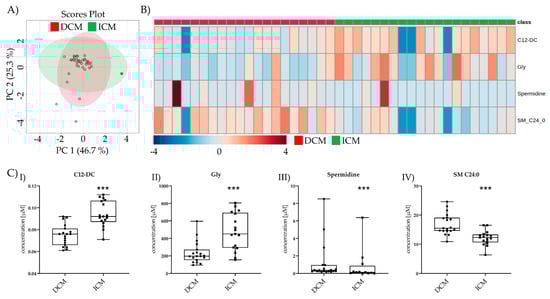 Comparison of significant metabolic parameters of DCM and ICM >100 days post-LVAD. (A) PCA of the significantly different metabolites >100 days post-LVAD DCM vs. >100 days post-LVAD ICM. (B) Heatmap visualization of the four metabolites significantly different between DCM and ICM >100 days post-LVAD. (C) I–IV C12-DC, Gly, spermidine, and SM C24:0 levels >100 days post-DCM vs. >100 days post-LVAD ICM. Depicted are min, max, median, and single values. Significance was calculated with a t-test) or the Mann–Whitney U test). * indicates significant to DCM (*** = p < 0.001).