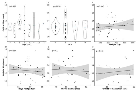 Relationship between pre-ovulatory follicle diameter and cow phenotype or timeline parameters. Panels (A–F) depict the relationship between follicle size at gonadotropin-releasing hormone administration to induce a pre-ovulatory gonadotropin surge (GnRH2) and cow age, body condition score (BCS), weight, days postpartum, hours from prostaglandin F2α administration (PGF) to GnRH2 administration, and hours from GnRH2 administration to follicle aspiration, respectively.