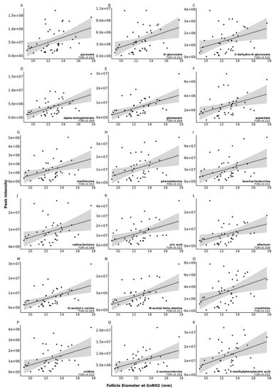 Scatter plots of the correlation between metabolite peak area and follicle diameter at the time of gonadotropin releasing hormone (GnRH2) administration to induce the pre-ovulatory gonadotropin surge for 18 metabolites, depicted in panels (A–R), that were significantly correlated with increasing follicle diameter at GnRH2 (FDR < 0.05).