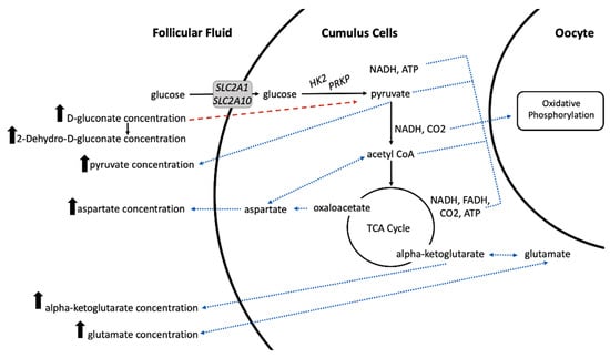 Proposed model of altered glucose metabolism in cumulus cells of small pre-ovulatory follicles. Increased concentration of pyruvate, aspartate, alpha-ketoglutarate, and d-glutamate in the follicular fluid of larger pre-ovulatory follicles is likely the result of increased glucose consumption by the cumulus cells and more efficient glucose, pyruvate, and tricarboxylic acid (TCA) cycle metabolism in the cumulus cells of larger follicles (represented by solid black arrows). Our previous results of increased transcript abundance for glucose transporters (SLC2A1, SLC2A10) and glycolytic enzymes (HK2, PRKP) in cumulus cells of large versus small pre-ovulatory follicles support the proposed model. Increased production of pyruvate and downstream metabolic products allows increased metabolite abundances to be transferred back into the follicular fluid and to the oocyte to support energy production needed for oocyte maturation, fertilization, cleavage, and early embryo development (represented by blue dotted arrows). Increased concentration of d-gluconate and its downstream product 2-Dehydro-D-gluconate in the follicular fluid of larger follicles is likely due to reduced import of D-gluconate into the cumulus cells (represented by a dashed red arrow) because of preferential import of glucose.