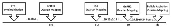Timeline for synchronization of pre-ovulatory follicle development. GnRH1, gonadotropin releasing hormone administration to turn over a new follicular wave at the onset of synchronization; PGF, prostaglandin F2α; GnRH2, gonadotropin releasing hormone administration to induce the pre-ovulatory gonadotropin surge.