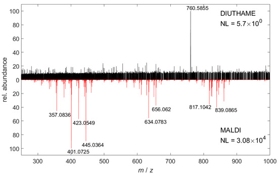Blank spectra of pure matrix or DIUTHAME membranes without applying analytes differed significantly (Figure 1). Since the MALDI matrix itself is desorbed and ionized, it produces characteristic signals in the mass spectrum. From blank (Figure 1) or incompletely attached DIUTHAME foils (Figures S2 and S3), no significant signals were observed, an observation typical for SALDI MS [18,32]. Compound identification and quantification take advantage of background-free spectra in (partly) overlapping areas of spectra, even under high mass resolution conditions.