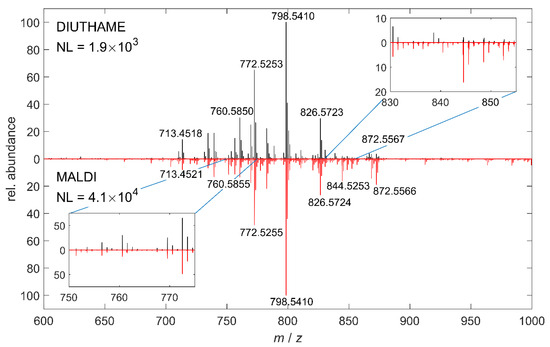 Comparison of 100 summed mass spectra acquired by DIUTHAME (black) and MALDI (red) MSI, respectively, from adjacent mouse brain tissue sections in the cerebellum region in positive-ion mode.