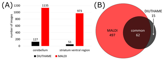 (A) Number of images available from mouse brain tissue with DIUTHAME and MALDI MSI, respectively. Only phospholipid signals in a mass range between m/z 600–1000 with a pixel coverage of >5% were considered, matrix signals were excluded. (B) Venn diagram of annotated phospholipids from signals detected with a MALDI or DIUTHAME MSI measurement.