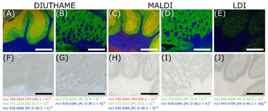 Comparison of DIUTHAME, MALDI and LDI MSI from adjacent mouse brain tissue sections, acquired with a pixel size of 5 µm, an image size of 300 × 250 pixels, a laser focal diameter of 5 µm, in a mass range of m/z 600–1000. (A), (F), DIUTHAME MS image of mouse brain cerebellum with corresponding microscopic image. (B,G), DIUTHAME MS image of mouse brain striatum ventral region with corresponding microscopic image. (C,H), MALDI MS image of mouse brain cerebellum with corresponding microscopic image. (D,I), MALDI MS image of mouse brain striatum ventral region with corresponding microscopic image. (E,J), LDI MS image of mouse brain cerebellum with corresponding microscopic image. Thickness of tissue sections (A,B), 50 µm, (C–E), 20 µm. Scale bars: 500 µm.