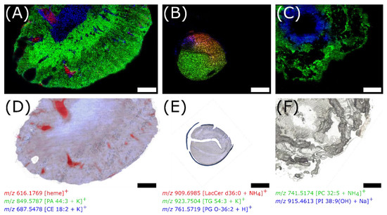 MS images of tissue sections from various organisms using DIUTHAME as the ionization assisting membrane (A–C) and corresponding microscopic images of the same (E) or an adjacent section (D,F). (A), 50 µm thick mouse kidney section, pixel size 30 µm, 276 × 161 pixels, m/z 400–1600. (B), 80 µm thick germinating rapeseed section, pixel size 20 µm, 297 × 245 pixels, m/z 500–1500. (C), 150 µm thick Spodoptera littoralis caterpillar section, pixel size 20 µm, 300 × 250 pixels, m/z 250–1000. Scale bars: 1 mm.