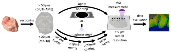 Thin tissue sections from fresh-frozen tissue were prepared using a microcryotome (Microm HM 525, Thermo Fisher Scientific GmbH, Bremen, Germany) at −20 °C. Tissue sections with a thickness of 20 µm were chosen for MALDI and LDI measurements, whereas for experiments with DIUTHAME, tissue sections with a thickness of 50–150 µm were used (Figure 6).