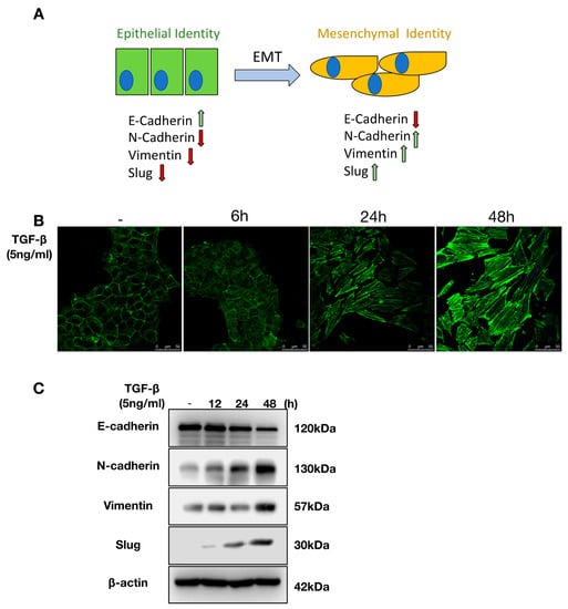 Epithelial-to-mesenchymal transition (EMT) is a dynamic process in which cuboidal epithelial apical–basal polarized cells convert into motile cells with a mesenchymal spindle-shaped phenotype. This transition is accompanied by a decrease in expression of epithelial markers such as E-cadherin and increased expression of mesenchymal markers such as N-cadherin and Vimentin [,]. EMT is a key process for embryonic and organ development. Primitive epithelial cells transition into motile mesenchymal cells at various stages of embryogenesis, and mesenchymal cells produced by EMT can transition back into epithelial cells by undergoing mesenchymal-to-epithelial transition (MET) []. In the adult body, EMT is associated with wound healing, organ fibrosis, and cancer progression []. EMT can facilitate cancer cell migration out of primary tumors, leading to invasion into distant tissues. Moreover, EMT can provide cancer cells with characteristics of stem cells and thereby increases the resistance to cancer therapy [,].