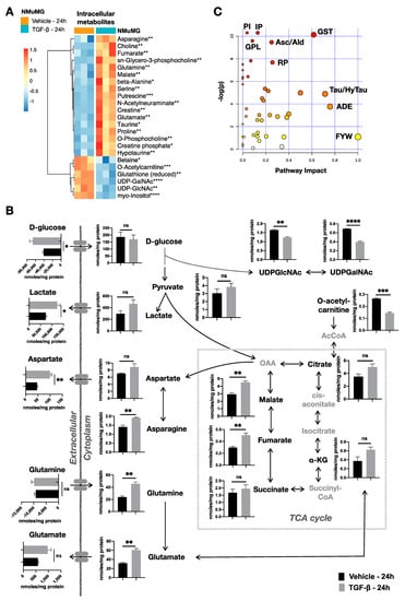 Analysis of TGF-β-induced metabolic changes in NMuMG cells after 24 h treatment. (A) Heatmap of standardized concentrations (z-scores) of significantly different (p < 0.05, n = 3) intracellular metabolites after addition of TGF-β (5 ng/mL) compared to vehicle solvent control. (B) Schematic representation of metabolic changes induced by TGF-β (5 ng/mL) in NMuMG cells, including glycolysis, tricarboxylic acid (TCA) cycle, and aspartate production. Results are shown as mean ± s.d; * p < 0.05; ** p < 0.01; *** p < 0.001; **** p < 0.0001; ns: non-significant. (C) Changes in metabolic pathways after TGF-β (5 ng/mL) or vehicle control treatment of NMuMG cells. Pathway scores were calculated based on the number of NMuMG cell-derived metabolites present in a pathway and the sign of change after TGF-β addition. PS of 1, as shown here for the pathway of choline metabolism in cancer, indicates that all detected metabolites in the pathway exhibited the same change after TGF-β addition. The thickness of each point represents the number of detected metabolites in each pathway. IP: inositol phosphate; PI: phosphatidylinositol; GST: glycine, serine, and threonine; RP: arginine and proline; Tau/HyTau: taurine and hypotaurine; ADE: alanine, aspartate, and glutamate; GPL: glycerophospholipid.