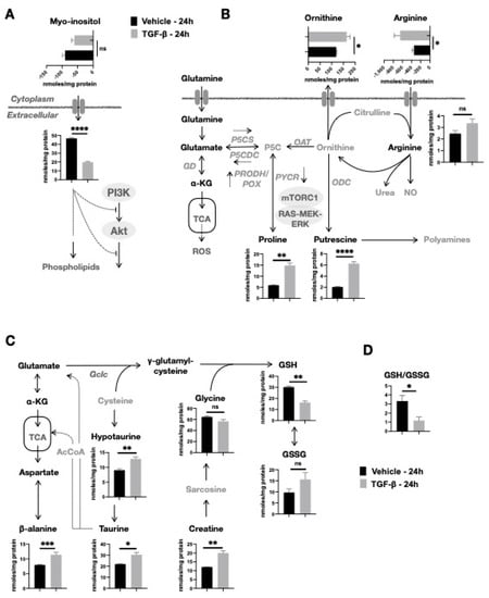 Effect of TGF-β on myo-inositol, putrescine, proline levels, and redox state. (A) TGF-β decreases Myo-inositol in NMuMG cells. (B) TGF-β (5 ng/mL) treatment induced significant changes in Arginine–Proline metabolism, resulting in synthesis of putrescine. (C) Glutathione disulfide (GSSG) levels were higher after TGF-β (5 ng/mL) treatment and, in contrast, there were reduced glutathione (GSH) levels. TGF-β induced hypotaurine and its product taurine level. The former is synthesized from cysteine when the latter is not used for the synthesis of glutathione, while taurine can be further directed to several pathways. (D) TGF-β (5 ng/mL) treatment reduced the GSH/GSSG ratio (on the y-axis), which was reduced in NMuMG cells. Results are shown as mean ± s.d; * p < 0.05; ** p < 0.01; *** p < 0.001; **** p < 0.0001; ns, non-significant.