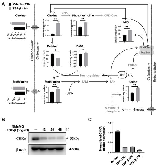 Effects of TGF-β on choline metabolism and CHKα expression. (A) Uptake of extracellular methionine and choline was not affected after TGF-β (5 ng/mL) treatment; however, intracellular choline and its direct product phosphocholine and indirect intermediate sn-glycerophosphocholine (GPC) were significantly increased. Betaine, also synthesized by choline, was decreased upon treatment of NMuMG cells with TGF-β (5 ng/mL). Results are shown as mean ± s.d; * p < 0.05; ** p < 0.01; ns, non-significant. (B) TGF-β (5 ng/mL) treatment reduced the CHKα protein expression in NMuMG cells. (C) TGF-β (5 ng/mL) reduced CHKα mRNA expression in NMuMG cells.