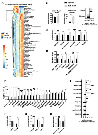 We next tested effects on metabolic changes in human premalignant MCF10A-Ras breast cells upon treatment with TGF-β. Consistent with our findings in mouse normal NMuMG cells, we observed morphological changes and increased expression of N-cadherin and Vimentin after TGF-β stimulation [,] (Figure S1). Compared with NMuMG cells, the TGF-β-induced EMT in MCF10A-Ras cells occurs later (apparent after 72 h of stimulation) and less pronounced. Furthermore, TGF-β-induced metabolic reprogramming to MCF10A-Ras, which was evident at 72 h post-TGF-β administration over a time course of 96 h (Figure S3). Looking specifically at 72 h for the effects of TGF-β treatment, we found that 54 intracellular metabolites were significantly altered compared to vehicle-treated MCF10A-Ras cells (Figure 5A). While intracellular glucose and lactate levels were increased with TGF-β, consumption and secretion of glucose and lactate, respectively, were not significantly different compared to vehicle control-treated cells (Figure 5B). Furthermore, TGF-β also induced an increase in all TCA cycle intermediates (Figure 5C), as we observed in NMuMG cells. In contrast to NMuMG cells, all the products of the hexosamine and glucuronic acid pathway were increased with TGF-β (Figure 5D), and we also observed increased intracellular pools of most amino acids with a notable exception of proline in MCF10A-Ras cells (Figure 5E). Proline synthesis was found to be induced by TGF-β in NMuMG cells; however, in MCF10A-Ras, intracellular proline was lower compared to vehicle, despite higher proline uptake from the culture medium (Figure 5I). Another notable difference of MCF10A-Ras was significant secretion of glutamine and glutamate in TGF-β-treated cells (Figure 5I), while we also found a significant increase in GSSG but no difference in GSH (Figure 5F). Although these findings point to different TGF-β-induced metabolic adaptation between the NMuMG and MCF10A-Ras cells, we did find similar results with regard to choline metabolism, myo-inositol, and putrescine. Specifically, TGFβ induced free choline and GPC accumulation in MCF10A-Ras cells, but decreased PCho (Figure 5G), while there was no difference in choline uptake (Figure 5I). In addition, upon TGF-β treatment the myo-inositol and putrescine levels were significantly decreased and increased, respectively (Figure 5H). Taken together, these results suggested that some metabolic pathways such as polyamine synthesis and choline metabolism are affected by TGF-β in both NMuMG and MCF10A-Ras cells during EMT.