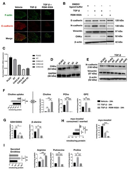 Effect of TGF-β in the absence or presence of RSM-932A on TGF-β-induced EMT, phosphocholine, and myoinositol metabolism. (A) Treatment with RSM-932A (10 μM) inhibited the F-actin stress fiber formation and re-localization of E-cadherin that was induced by TGF-β (5 ng/mL) treatment with 24 h. (B) The increased expression of N-cadherin and Vimentin induced by TGF-β (5 ng/mL) were downregulated with RSM-932A (10 μM) treatment. (All samples were run on the same gel). (C) The knockdown efficiency of CHKA in mRNA level in NMuMG cell line. (D) The knockdown efficiency of CHKα in protein levels in NMuMG cells. (E) CHKA knockdown decreased TGF-β-induced N-cadherin and Vimentin expression. (F) Addition of the CHKα inhibitor RSM-932A (10 μM) together with TGF-β (5 ng/mL) completely halted the production of O-phosphocholine by choline. Furthermore, both choline uptake from the media and choline’s intracellular levels were reduced and increased, respectively. (G) Inhibition of CHKα did not induce any effect in the glutathione (GSH)/glutathione disulfide (GSSG) ratio (ratio in nmoles/mg protein on y-axis), while a marked decrease in β-alanine was observed. (H) Myo-inositol was decreased with TGF-β (5 ng/mL) and RSM-932A (10 μM) co-treatment, and a secretion of myo-inositol to the culture medium was observed. (I) Putrescine and proline were decreased upon TGF-β (5 ng/mL) and RSM-932A (10 μM) co-treatment, while arginine was notably increased. Results are shown as mean ± s.d; * p < 0.05; ** p < 0.01; *** p < 0.001; **** p < 0.0001; ns, non-significant.