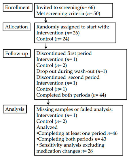 The intervention diet was a diet combining foods with suggested anti-inflammatory effects, e.g., a Mediterranean style diet and the control diet intended to correspond nutritionally to the average dietary intake in men and women in Sweden (i.e., a Western diet). The diets have been described in detail elsewhere [15]. In brief, the intervention breakfasts contained wholegrain cereals, low-fat dairy, nuts, blueberries and pomegranate, and juice shots with probiotics. The main meals contained fish (mainly salmon) 3–4 times/week and vegetarian dishes 1–2 times/week. Two fruits per day were provided to eat between meals. The participants were also instructed to limit their intake of red meat to ≤3 times/week, to choose low-fat dairy and wholegrain cereals, to eat ≥5 portions/weekof fruit, berries, and vegetables (including those provided) and to use oil or margarine for cooking.