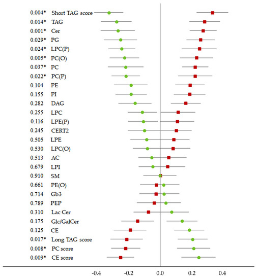 In addition, four component scores, long TAG score, CE score, PC score and short TAG score were evaluated. The first two scores were higher after the intervention diet compared to after the control diet whereas the last two scores were lower, indicating that the lipid composition improved (Figure 2). Changes in concentrations of lipid classes and scores (median and interquartile range) are presented in Supplementary Materials Table S1. CE score was no longer statistically significant in the sensitivity analysis.