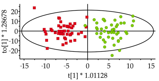 OPLS-EP and OPLS-DA models were used to investigate discrimination between diet regimens and to identify variables responsible for class separation (Table 3). Permutation test confirmed that the OPLS-DA models were of high quality (Supplementary Materials Figures S1 and S2).