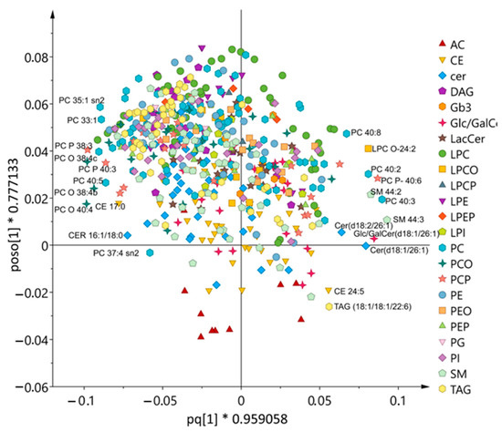 OPLS-DA loading scatter plot showing the differences in the lipid signature of the changes in serum lipid species between intervention diet (to the right) and control diet (to the left).