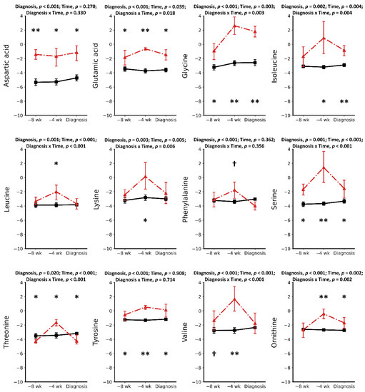 Concentrations of amino acids in the serum of healthy cows (solid line) and pre-retained placenta or retained placenta (dashed line) cows at −8 and −4 weeks prepartum or at the week of retained placenta diagnosis. Asterisks († p < 0.1; * p < 0.05; ** p < 0.001) indicate significant differences between groups at the respective time points. Results are presented in log2.