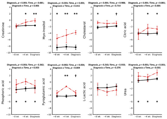 Concentrations of some of the serum metabolites detected in healthy cows (CON) (solid line) and pre-retained placenta or retained placenta (dashed) cows at −8 and −4 weeks prepartum and at the week of retained placenta diagnosis. Asterisks († p < 0.1; * p < 0.05; ** p < 0.001) indicate significant differences between groups at the respective time points. Results are presented in log2.
