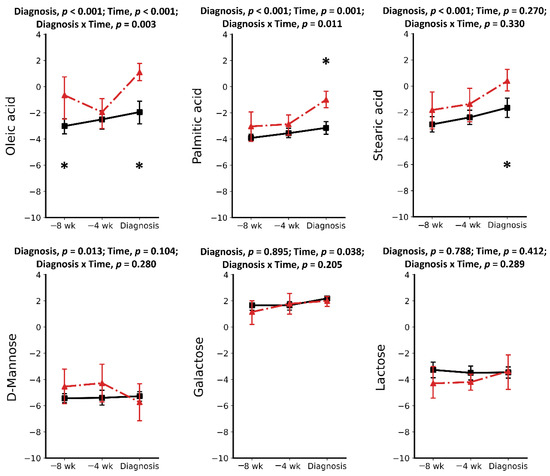 Concentrations of organic acids and carbohydrates in the serum of healthy cows (solid line) and pre-retained placenta or retained placenta (dashed) cows. Asterisk (* p < 0.05) indicates significant differences between groups at −8 and −4 weeks prepartum and at the week of retained placenta diagnosis. Results are presented in log2.
