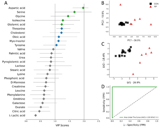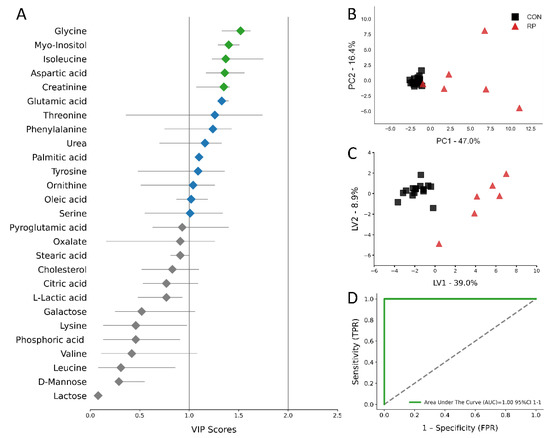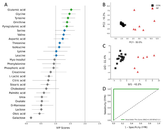 (A) Variables ranked by variable importance in projection (VIP), (B) PCA, (C) PLS-DA (permutation test: p < 0.05) of 16 healthy control (CON) cows and 6 cows pre- RP cows at −8 weeks prior to parturition. (D) ROC curve for five top-performing metabolites in Vip Scores.