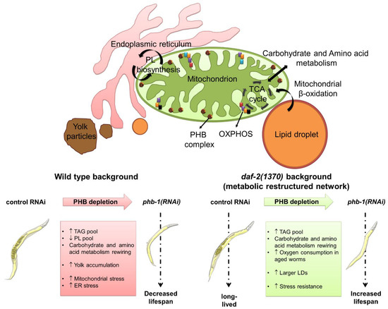 A key determinant of structural and functional integrity of eukaryotic membrane-bound organelles is membrane lipid composition [123,124]. As mentioned above, the PHB complex is important for mitochondrial membrane maintenance. Interestingly, depletion of DNJ-21, which physically and functionally interacts with PHB in remodelling mitochondrial cardiolipin, mimicked the differential effect of PHB deficiency on the lifespan of wild type and daf-2 mutants [53]. It would be interesting to investigate if DNJ-21 phenocopies other PHB phenotypes including effects on LD and YP, and lifespan extension in other metabolically compromised mutants. Importantly, reduced sphingolipid and ceramide synthesis extend the lifespan of worms and flies [125]. Recently, PHB was found to be required for the lifespan extension conferred by reduced sphingolipid synthesis in C. elegans. Moreover, in the same study, PHB depletion was found to suppress the impaired mitochondrial homeostasis, lipogenesis, and yolk formation of sgk-1 [114]. In summary, the PHB complex plays a crucial role in the determination of mitochondrial function by affecting, directly or indirectly, the maintenance and composition of mitochondrial membranes and by leading to systemic changes in metabolism, which ultimately, differentially modulate lifespan depending on the metabolic state of the animals (Figure 1).