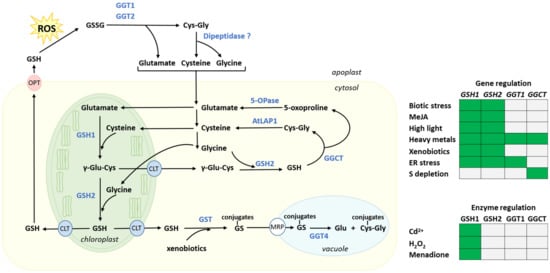 Glutathione synthesis and degradation pathways in Arabidopsis. Arrows indicate metabolic fluxes and inter-compartment transport. Metabolites are in black, and enzymes in blue. Known transporters are circled. A question mark indicates that experimental evidence is incomplete. GSH is synthesized in the chloroplast by the enzymes GSH1 and GSH2 from Glu, Cys and Gly. The reaction catalyzed by GSH2 also occurs in the cytosol. Degradation of GSH is catalyzed by the enzymes GGCT, AtLAP1 and 5-OPase in the cytosol. This sequence of reactions recycles the amino acids used in GSH synthesis. Degradation of GSSG occurs in the apoplast by GGT1, GGT2 and a dipeptidase still uncharacterized. This pathway also recycles Glu, Cys and Gly, which can be taken up by the cell and serve in GSH re-synthesis. GGT4 catalyzes the partial degradation of the glutathione moiety of GS conjugates in the vacuole. GSH pools are also present in mitochondria, ER and peroxisomes (not represented in the figure). The heatmap recapitulates the main regulatory features discussed in the text (regulation at the gene and enzyme levels). Green: positive effect; grey: no effect or not discussed. MeJa, methyl jasmonate.