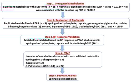 The nine successfully replicated metabolites were then tested for validation based on BP response in PEAR-2 and PEAR separately, which was assessed after ~8–9 weeks of treatment. Among those nine metabolites, three were associated with BP response (Step 3). Two (caprate and sphingosine-1-phosphate) that were associated with higher baseline PRA, were also significantly associated with BP responses to metoprolol and HCTZ, respectively, in the expected directions (validated). Specifically, the baseline levels of caprate were associated with a greater systolic BP (SBP) reduction to metoprolol (β = −1.7 ± 0.6, p = 0.006), which means that a 10% increase in the baseline levels of caprate was associated with about 0.2% greater SBP reduction to metoprolol. On the other hand, levels of sphingosine-1-phosphate were associated with reduced SBP and diastolic BP (DBP) responses to HCTZ (β = 7.6 ± 2.8, p = 0.007; β = 4.1 ± 1.7, p = 0.018, respectively), which means that a 10% increase in the baseline levels of sphingosine-1-phosphate was associated with about 0.7% and 0.4% lower reduction in SBP and DBP responses to HCTZ, respectively. Additionally, the metabolite 1-palmitoleoyl-GPC (16:1) associated with higher baseline PRA was nominally associated with reduced HCTZ SBP response (β = 4.1 ± 2.0, p = 0.038). This means that a 10% increase in the baseline levels of 1-palmitoleoyl-GPC (16:1) was associated with a 0.4% lower reduction in SBP to HCTZ (Figure 1; Table 4).