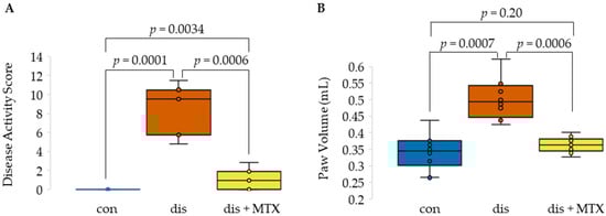 Effects of MTX on disease activity in the CIA mouse model. Box and whisker plots displaying (A) disease activity scores and (B) paw volumes comparing healthy control mice (con; n = 10), CIA induced disease mice (dis; n = 8), and CIA mice treated with MTX (dis + MTX; n = 9).