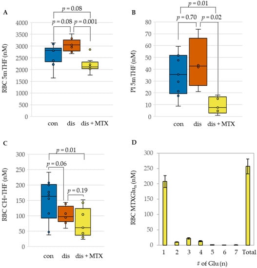 Influence of MTX treatment on folate concentrations and RBC disposition of MTX in the CIA mouse model. Comparison of (A) RBC 5mTHF, (B) Plasma 5mTHF, (C) RBC CH=THF, and (D) polyglutamate distribution of RBC MTX in healthy control (con; blue; n = 10), CIA disease mice (dis; orange; n = 8), and CIA disease mice treated with MTX (dis + MTX; yellow; n = 9).