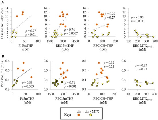 Spearman’s correlations of (A) DAS and (B) PV with folate (5mTHF and CH=THF) and MTX (MTXTotal) levels in plasma and/or RBCs. Groups include, dis (orange; n = 8) and dis + MTX (yellow; n = 9).