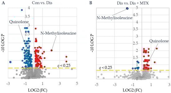 Identification of metabolites of interest associated with CIA disease induction and MTX therapy. Plasma metabolomics data were subjected to univariate analysis using MetaboAnalyst 5.0 providing volcano plots for (A) control (Con) (n = 10) vs. disease mice (Dis) (n = 8) and (B) disease mice (Dis) (n = 8) vs. disease mice treated with MTX (Dis + MTX) (n = 9). Red-colored metabolites were found to increase, and blue-colored metabolites were found to decrease (q < 0.25).