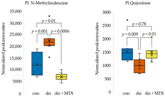 The previously identified metabolites of interest, NMI and quinolone, showed altered levels in disease and displayed a normalization towards healthy control levels following MTX therapy. The metabolite levels for NMI and quinolone in control, disease, and MTX-treated disease mice were plotted as box and whisker plots (Figure 5). NMI levels were found to be elevated in disease mice and were markedly reduced with MTX treatment. In contrast, quinolone levels were reduced in disease mice and increased towards control levels with MTX treatment. Mean levels of NMI were three-fold lower in MTX treated mice compared to disease mice, whereas mean levels of quinolone were 31% higher in MTX treated mice compared to disease mice.